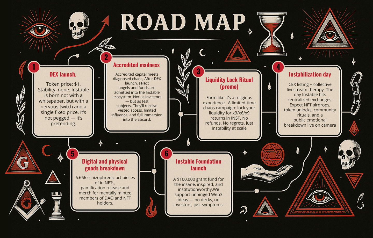 Accredited capital meets diagnosed chaos, After DEX launch, select angels and funds are admitted into the Instable ecosystem. Not as investors — but as test subjects. They’ll receive vested access, limited influence, and full immersion into the absurd.